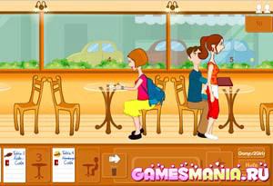 Вы устроились официанткой в небольшой кафетерий. В зале всего пять столиков, каждый из которых рассчитан на двоих. К Вам приходят клиенты и занимают понравившиеся места. На иконках внизу Вы можете увидеть, что пришел посетитель и присел за определенный столик. Подходите к нему и принимайте заказ.