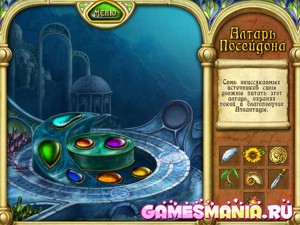Алтарь Посейдона - особое место силы. Сломайте печати на нем, чтобы начать увлекательную игру. Рассмотрите предметы на боковой панели: перо, золотая монета, подсолнечник. Теперь изучите, какие печати находятся на алтаре. На печать металла возложите меч, раковину на печать воды и так далее.